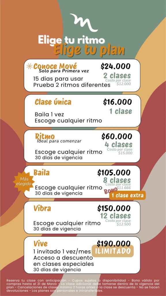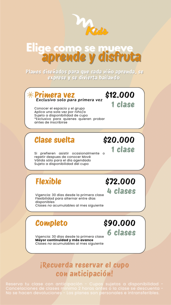 Nuestros precios ¡Elige como quieres moverte! En Mové puedes empezar a tu ritmo.Desde probar tu primera clase hasta disfrutar planes ilimitados para bailar todo el mes. Planes Mové Diseñados para que encuentres la forma perfecta de bailar, entrenar y disfrutar la música. Mové Kids Planes pensados para que los niños aprendan a bailar, se expresen y disfruten el movimiento mientras desarrollan confianza y coordinación. Reservar mi clase